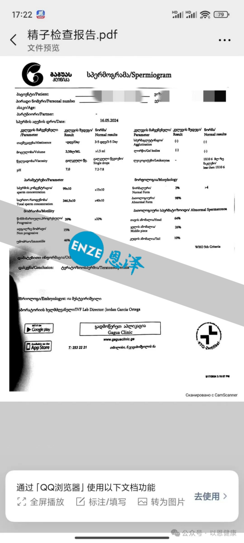 精子的检测结果国内外不同,精子体检结果一般会有一定的波动。格鲁吉亚医院体检,Z先生的精子报告有畸形精子症,正常形态率为2%。