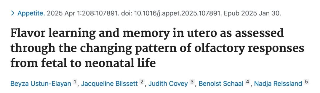 Flavor learning and memory in utero as assessed through the changing pattern of olfactory responses from fetal to neonatal life. Appetite. 2025 Apr 1;208:107891. doi: 10.1016/j.appet.2025.107891. Epub 2025 Jan 30.