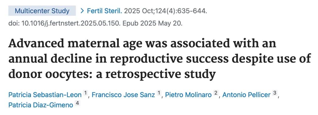 Advanced maternal age was associated with an annual decline in reproductive success despite use of donor oocytes: a retrospective study. Fertil Steril. 2025 Oct;124(4):635-644. doi: 10.1016/j.fertnstert.2025.05.150. Epub 2025 May 20.