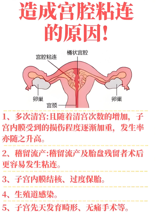 2.感染:细菌或者病毒感染可引起宫腔局部发生炎症形成,形成瘢痕性粘连,比如常见的子宫内膜炎、子宫内膜内膜结核等;