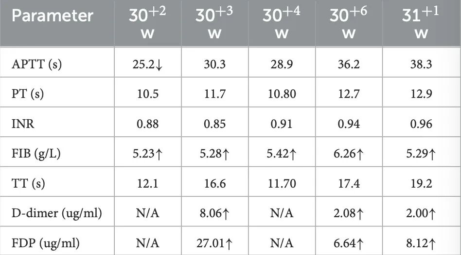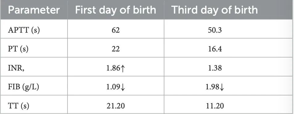 结果显示新生儿出生第1天INR轻度升高,第1天和第3天FIB轻度降低,这可能和妈妈的病情相关。