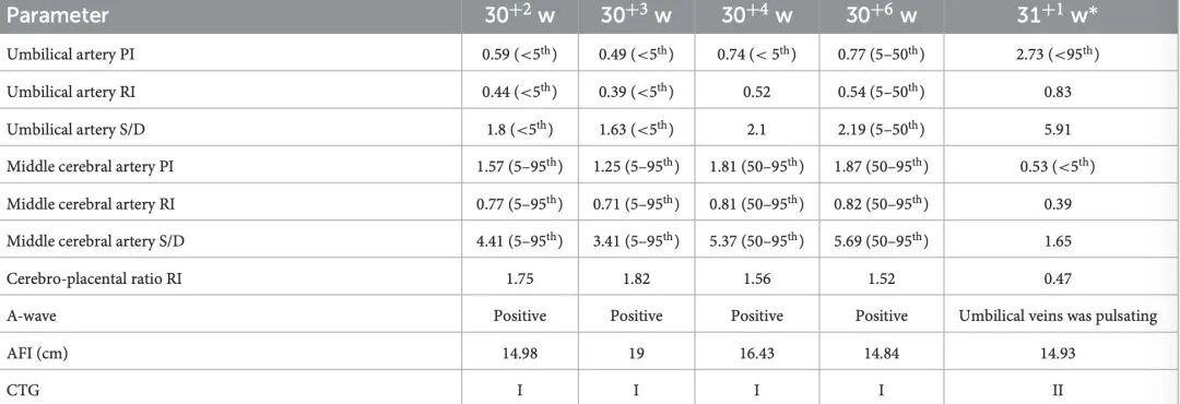 在孕31+1周时,因胎心监护和多普勒超声发现异常,提示胎儿窘迫,进行了紧急剖宫产,娩出女婴,体重1815克,新生儿评分3-8-8分。