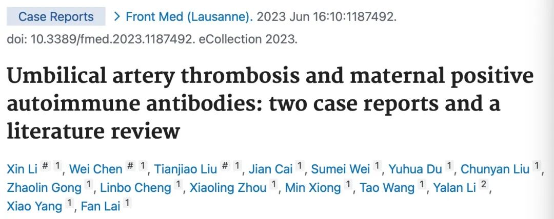 参考文献Umbilical artery thrombosis and maternal positive autoimmune antibodies: two case reports and a literature review. Front Med (Lausanne). 2023 Jun 16;10:1187492. doi: 10.3389/fmed.2023.1187492.