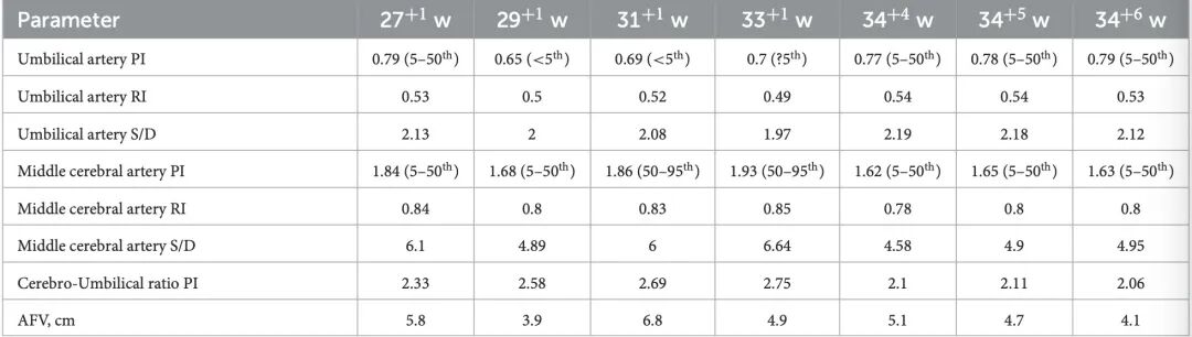 孕30+4周时超声检查显示胎儿大小正常,脐血流S/D比值2.1,羊水指数14.98厘米.