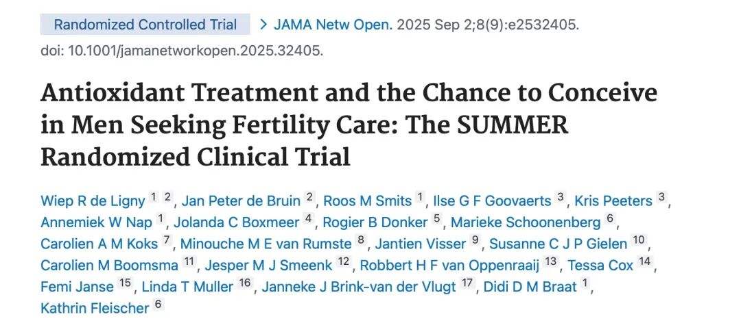 参考文献Antioxidant Treatment and the Chance to Conceive in Men Seeking Fertility Care: The SUMMER Randomized Clinical Trial. JAMA Netw Open. 2025 Sep 2;8(9):e2532405. doi: 10.1001/jamanetworkopen.2025.32405.