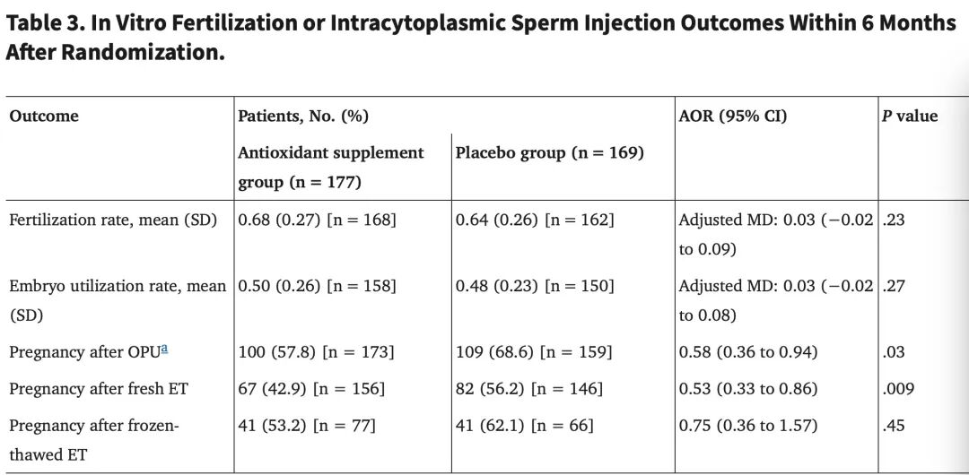 在取卵后妊娠率方面(这里包括鲜胚移植导致的妊娠,也包括了后续冻胚移植导致的妊娠),抗氧化剂组的怀孕率是57.8%(173人中的100人),也显著低于安慰剂组的68.6%(159人中的109人)。
