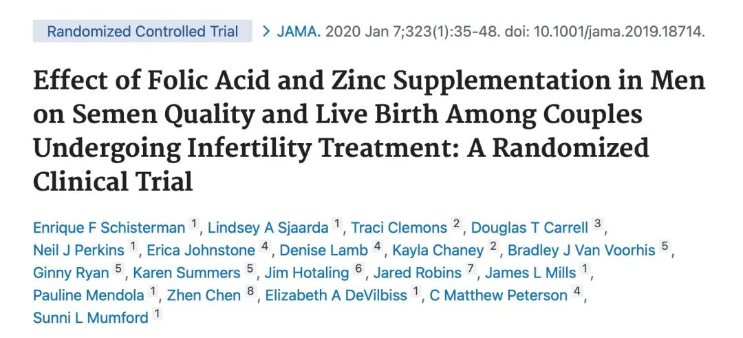 早在2020年,全球顶刊《JAMA》就发表过一个针对男性助孕补剂的随机对照研究,只不过补剂针对的是叶酸和锌两种补剂的复合补剂,我们一起来简单回顾一下。