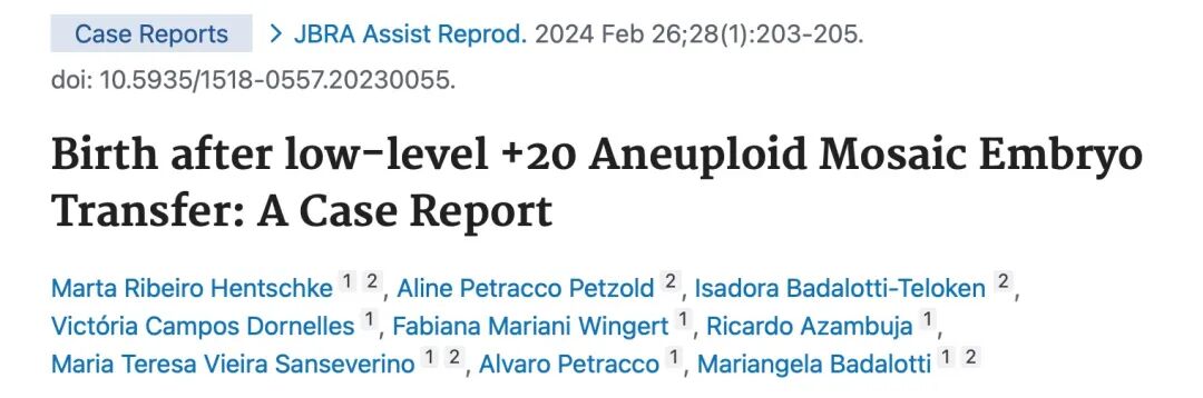 参考文献Birth after low-level +20 Aneuploid Mosaic Embryo Transfer: A Case Report. JBRA Assist Reprod. 2024 Feb 26;28(1):203-205. doi: 10.5935/1518-0557.20230055.