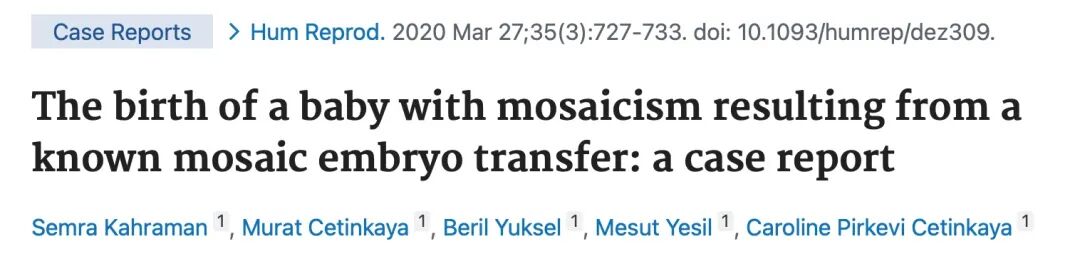 The birth of a baby with mosaicism resulting from a known mosaic embryo transfer: a case report. Hum Reprod. 2020 Mar 27;35(3):727-733. doi: 10.1093/humrep/dez309.