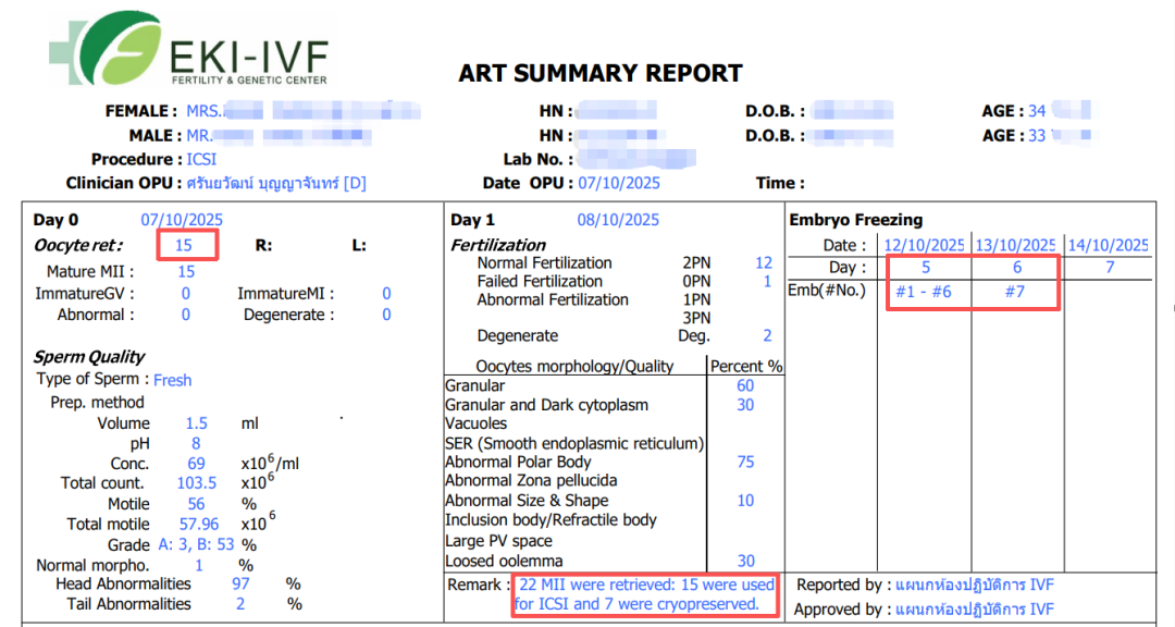 取成熟卵子22枚,选择15枚进行受精,得7枚囊胚,剩余7枚冷冻保存。实现既要成囊,又要冻胚的自由。
