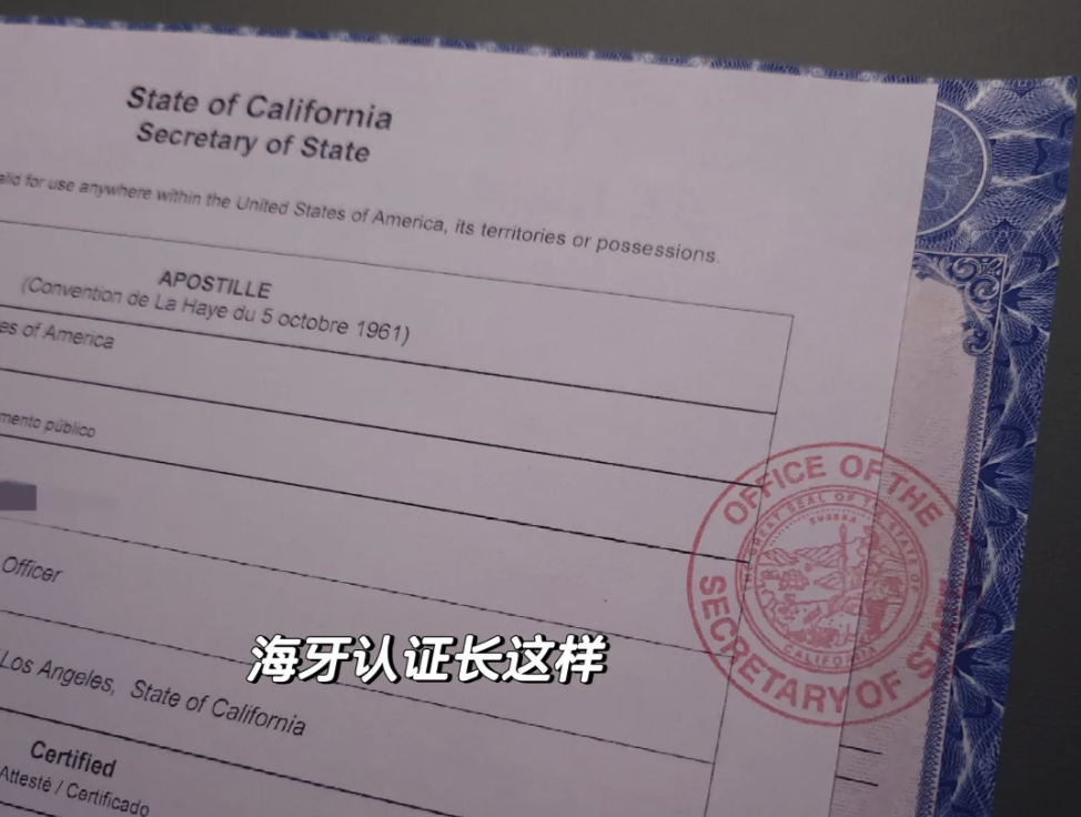 经州务卿认证的出生纸,确保其在中国具备法律效力(2023年11月中国加入海牙公约后取代原三级认证)。可以由代办机构持美宝出生纸至州务卿办公室办理认证(费用$26),全程约20分钟,现场可取。办理海牙认证的用途主要是美宝回到中国后的落户、旅行证换证等。